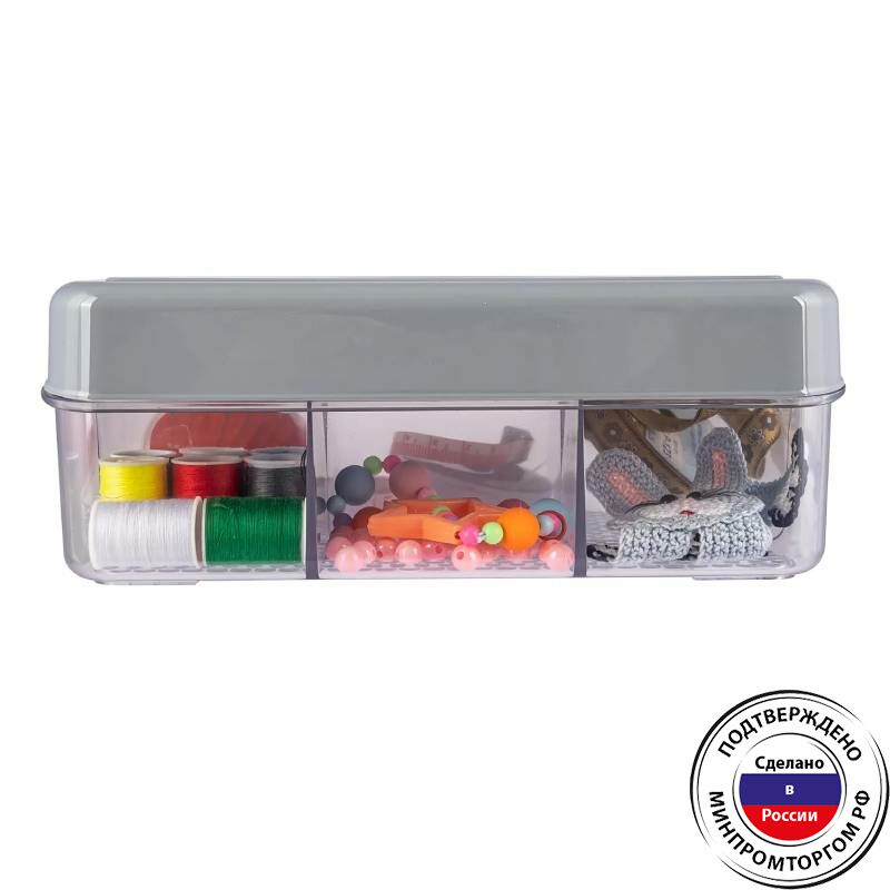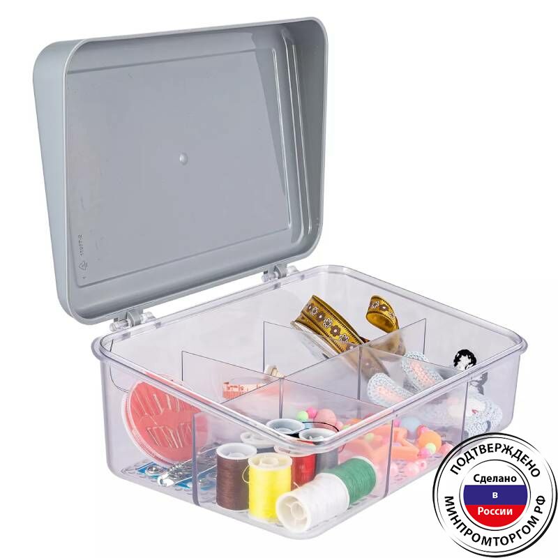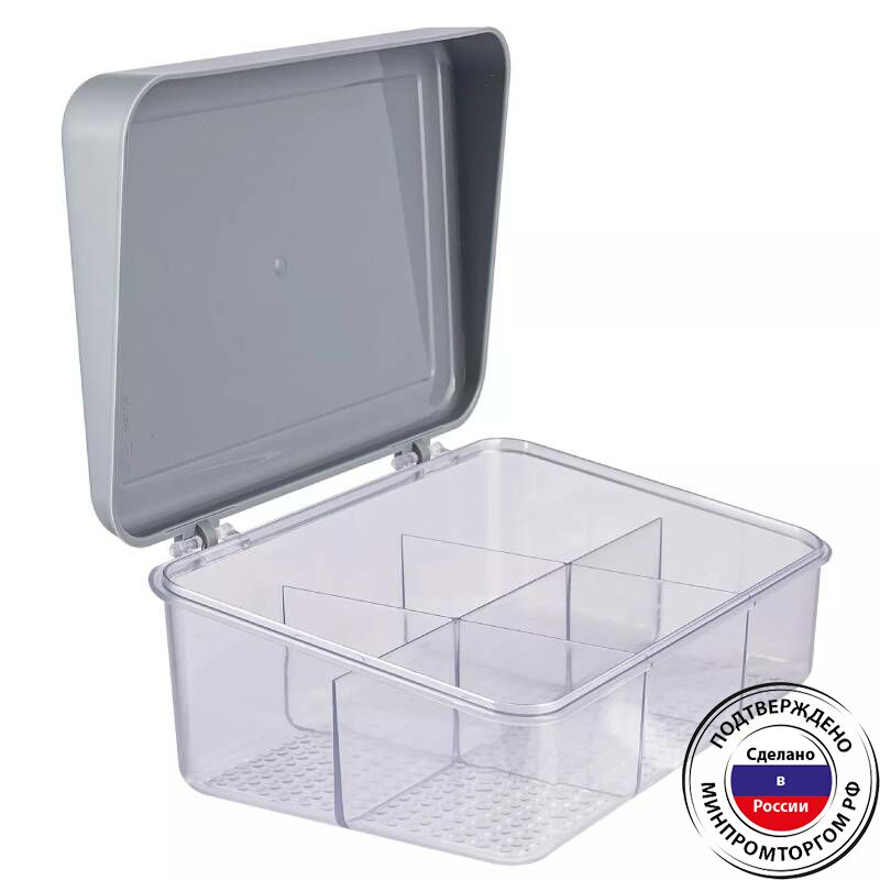 Органайзер для мелочей с 6 отделениями позволяет удобно распределить мелкие предметы, такие как канцелярские принадлежности, косметику, аксессуары или мелкие инструменты. Компактный размер органайзера делает его идеальным для использования на столе, в ящике или в шкафу. Корпус изготовлен из прозрачного полистирола, безопасного для контакта с пищевыми продуктами. Данные органайзеры вы всегда можете приобрести в нашем магазине polimerbyt-shop.ru