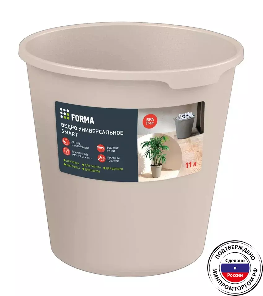 Ведро универсальное Smart объемом 11 литров — практичное и удобное решение для бытовых нужд. Изготовлено из прочного и экологически безопасного пластика. Выполненное в бежевом цвете ведро легко впишется в любой интерьер. Идеально подходит для сбора мусора, уборки, хранения различных предметов, а также может использоваться как стильное кашпо для цветов. Эргономичные боковые ручки гарантируют надёжный захват и комфорт при переноске. Данные ведра вы всегда можете приобрести в нашем магазине polimerbyt-shop.ru